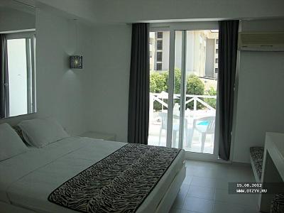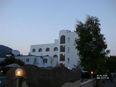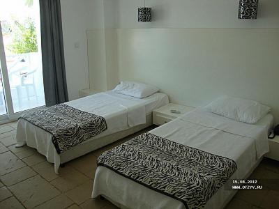 В сайте Пегаса указано, что в отеле имеются ТОЛЬКО двухспальные кровати. Собственно именно это стало одним из решающих моментов в выборе отеля. Так хотелось побыть с любимой вдвоём в романтичном местечке... но увы.. турки не романтики и наших порывов не поняли. Специально для нас раздобыли ОДИН ЕДИНСТВЕННЫЙ НОМЕР В ОТЕЛЕ с двумя односпальными кроватями и видом на лежаки у бассейна. Хотя при покупке тура отдельно оговаривалось что кровать будет одна! В турагенстве, посмотрели коса, но пометку сделали, лично видела! Приезжаем и такой сюрприз... ещё и менять не хотели, как же так "ту гёл энд ван бед"! Вид снаружи на номер - [img href=http://f.otzyv.ru/f/11/08/86319/9329/1508121230552.jpg]