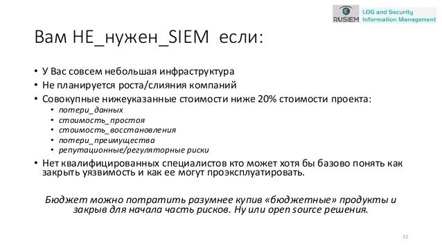 10. Вам НЕ_нужен_SIEM если: • У Вас совсем небольшая инфраструктура • Не планируется роста/слияния компаний • Совокупные нижеуказанные стоимости ниже 20% стоимости проекта: • потери_данных • стоимость_простоя • стоимость_восстановления • потери_преимущества • репутационные/регуляторные риски • Нет квалифицированных специалистов кто может хотя бы базово понять как закрыть уязвимость и как ее могут проэксплуатировать. Бюджет можно потратить разумнее купив «бюджетные» продукты и закрыв для начала часть рисков. Ну или open source решения. 11