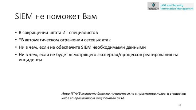 11. SIEM не поможет Вам • В сокращении штата ИТ специалистов • *В автоматическом отражении сетевых атак • Ни в чем, если не обеспечите SIEM необходимыми данными • Ни в чем, если не будет «смотрящего эксперта»/процессов реагирования на инциденты. Утро ИТ/ИБ эксперта должно начинаться не с просмотра логов, а с чашечки кофе за просмотром инцидентов SIEM 12