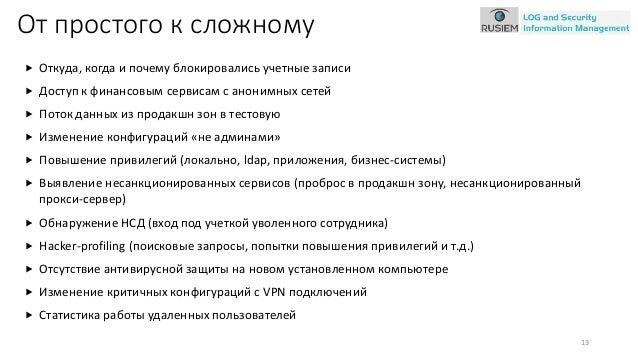 12. От простого к сложному Откуда, когда и почему блокировались учетные записи Доступ к финансовым сервисам с анонимных сетей Поток данных из продакшн зон в тестовую Изменение конфигураций «не админами» Повышение привилегий (локально, ldap, приложения, бизнес-системы) Выявление несанкционированных сервисов (проброс в продакшн зону, несанкционированный прокси-сервер) Обнаружение НСД (вход под учеткой уволенного сотрудника) Hacker-profiling (поисковые запросы, попытки повышения привилегий и т.д.) Отсутствие антивирусной защиты на новом установленном компьютере Изменение критичных конфигураций с VPN подключений Статистика работы удаленных пользователей 13