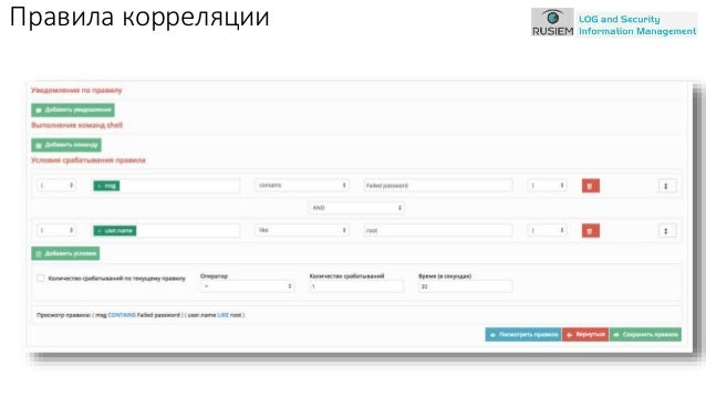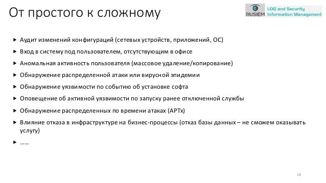 13. Аудит изменений конфигураций (сетевых устройств, приложений, ОС) Вход в систему под пользователем, отсутствующим в офисе Аномальная активность пользователя (массовое удаление/копирование) Обнаружение распределенной атаки или вирусной эпидемии Обнаружение уязвимости по событию об установке софта Оповещение об активной уязвимости по запуску ранее отключенной службы Обнаружение распределенных по времени атаках (APTx) Влияние отказа в инфраструктуре на бизнес-процессы (отказ базы данных – не сможем оказывать услугу) …… От простого к сложному 14