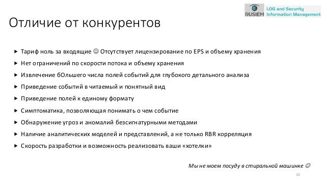 14. Отличие от конкурентов Тариф ноль за входящие Отсутствует лицензирование по EPS и объему хранения Нет ограничений по скорости потока и объему хранения Извлечение бОльшего числа полей событий для глубокого детального анализа Приведение событий в читаемый и понятный вид Приведение полей к единому формату Симптоматика, позволяющая понимать о чем событие Обнаружение угроз и аномалий безсигнатурными методами Наличие аналитических моделей и представлений, а не только RBR корреляция Скорость разработки и возможность реализовать ваши «хотелки» Мы не моем посуду в стиральной машинке 15