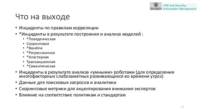 16. Что на выходе • Инциденты по правилам корреляции • *Инциденты в результате построения и анализа моделей : • *Поведенческая • Скоринговая • *Baseline • *Регрессионная • *Кластерная • Транзакционная • *Семантическая • Инциденты в результате анализа «умными» роботами (для определения многофакторных слабозаметных развивающихся во времени угроз) • Данные для поисковых запросов и аналитики • Скоринговые метрики для акцентирования внимания экспертов • Влияние на соответствие политикам и стандартам 17