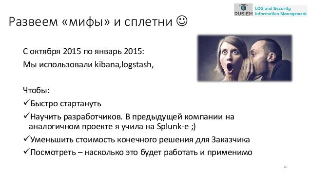 17. Развеем «мифы» и сплетни С октября 2015 по январь 2015: Мы использовали kibana,logstash, Чтобы: Быстро стартануть Научить разработчиков. В предыдущей компании на аналогичном проекте я учила на Splunk-е ;) Уменьшить стоимость конечного решения для Заказчика Посмотреть – насколько это будет работать и применимо 18