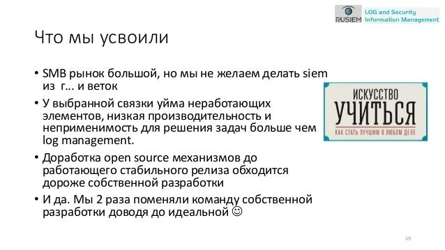 18. Что мы усвоили • SMB рынок большой, но мы не желаем делать siem из г... и веток • У выбранной связки уйма неработающих элементов, низкая производительность и неприменимость для решения задач больше чем log management. • Доработка open source механизмов до работающего стабильного релиза обходится дороже собственной разработки • И да. Мы 2 раза поменяли команду собственной разработки доводя до идеальной 19