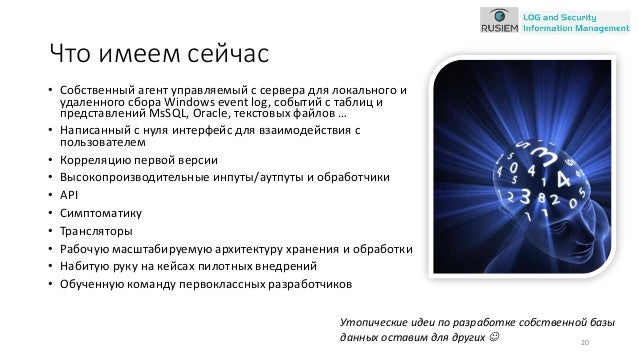 19. Что имеем сейчас • Собственный агент управляемый с сервера для локального и удаленного сбора Windows event log, событий с таблиц и представлений MsSQL, Oracle, текстовых файлов … • Написанный с нуля интерфейс для взаимодействия с пользователем • Корреляцию первой версии • Высокопроизводительные инпуты/аутпуты и обработчики • API • Симптоматику • Трансляторы • Рабочую масштабируемую архитектуру хранения и обработки • Набитую руку на кейсах пилотных внедрений • Обученную команду первоклассных разработчиков Утопические идеи по разработке собственной базы данных оставим для других 20