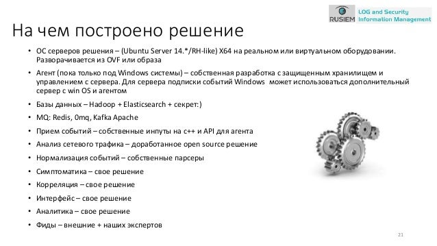 20. На чем построено решение • ОС серверов решения – (Ubuntu Server 14.*/RH-like) X64 на реальном или виртуальном оборудовании. Разворачивается из OVF или образа • Агент (пока только под Windows системы) – собственная разработка с защищенным хранилищем и управлением с сервера. Для сервера подписки событий Windows может использоваться дополнительный сервер с win OS и агентом • Базы данных – Hadoop + Elasticsearch + секрет:) • MQ: Redis, 0mq, Kafka Apache • Прием событий – собственные инпуты на с++ и API для агента • Анализ сетевого трафика – доработанное open source решение • Нормализация событий – собственные парсеры • Симптоматика – свое решение • Корреляция – свое решение • Интерфейс – свое решение • Аналитика – свое решение • Фиды – внешние + наших экспертов 21