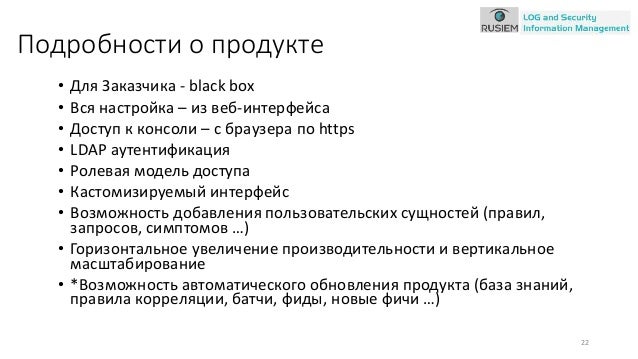 21. • Для Заказчика - black box • Вся настройка – из веб-интерфейса • Доступ к консоли – с браузера по https • LDAP аутентификация • Ролевая модель доступа • Кастомизируемый интерфейс • Возможность добавления пользовательских сущностей (правил, запросов, симптомов …) • Горизонтальное увеличение производительности и вертикальное масштабирование • *Возможность автоматического обновления продукта (база знаний, правила корреляции, батчи, фиды, новые фичи …) Подробности о продукте 22
