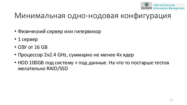 22. Минимальная одно-нодовая конфигурация • Физический сервер или гипервизор • 1 сервер • ОЗУ от 16 GB • Процессор 2x2.4 GHz, суммарно не менее 4х ядер • HDD 100GB под систему + под данные. На что то постарше тестов желательно RAID/SSD 23