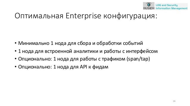 23. Оптимальная Enterprise конфигурация: • Минимально 1 нода для сбора и обработки событий • 1 нода для встроенной аналитики и работы с интерфейсом • Опционально: 1 нода для работы с трафиком (span/tap) • Опционально: 1 нода для API к фидам 24