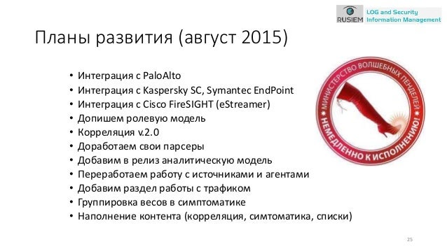 24. Планы развития (август 2015) • Интеграция с PaloAlto • Интеграция с Kaspersky SC, Symantec EndPoint • Интеграция с Cisco FireSIGHT (eStreamer) • Допишем ролевую модель • Корреляция v.2.0 • Доработаем свои парсеры • Добавим в релиз аналитическую модель • Переработаем работу с источниками и агентами • Добавим раздел работы с трафиком • Группировка весов в симптоматике • Наполнение контента (корреляция, симтоматика, списки) 25