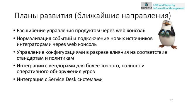 26. Планы развития (ближайшие направления) • Расширение управления продуктом через web консоль • Нормализация событий и подключение новых источников интеграторами через web консоль • Управление конфигурациями в разрезе влияния на соответствие стандартам и политикам • Интеграции с вендорами для более точного, полного и оперативного обнаружения угроз • Интеграция с Service Desk системами 27