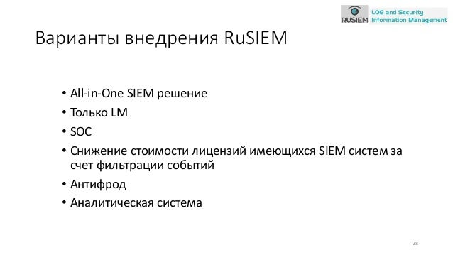 27. Варианты внедрения RuSIEM • All-in-One SIEM решение • Только LM • SOC • Снижение стоимости лицензий имеющихся SIEM систем за счет фильтрации событий • Антифрод • Аналитическая система 28