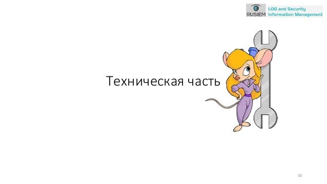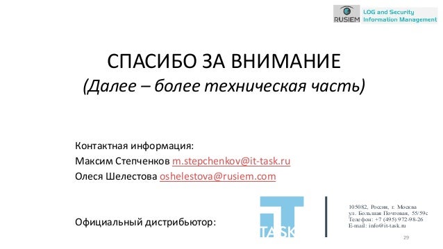 28. Контактная информация: Максим Степченков m.stepchenkov@it-task.ru Олеся Шелестова oshelestova@rusiem.com Официальный дистрибьютор: СПАСИБО ЗА ВНИМАНИЕ (Далее – более техническая часть) 105082, Россия, г. Москва ул. Большая Почтовая, 55/59с1 Телефон: +7 (495) 972-98-26 E-mail: info@it-task.ru 29