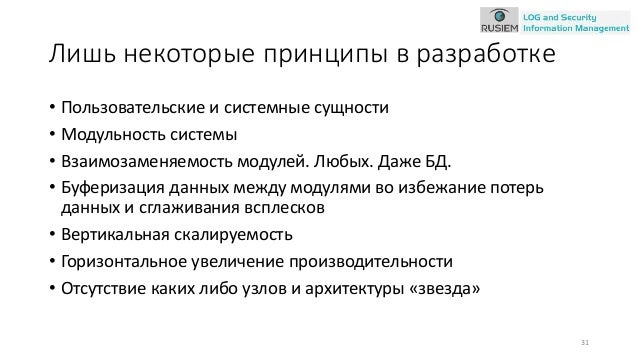 30. Лишь некоторые принципы в разработке • Пользовательские и системные сущности • Модульность системы • Взаимозаменяемость модулей. Любых. Даже БД. • Буферизация данных между модулями во избежание потерь данных и сглаживания всплесков • Вертикальная скалируемость • Горизонтальное увеличение производительности • Отсутствие каких либо узлов и архитектуры «звезда» 31