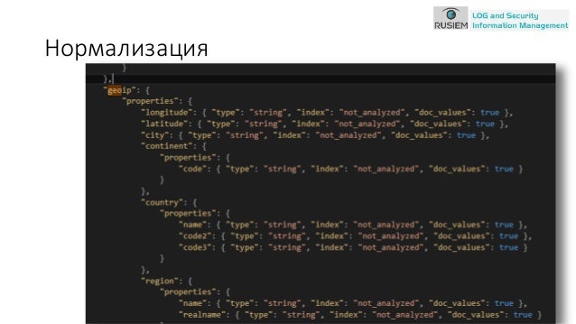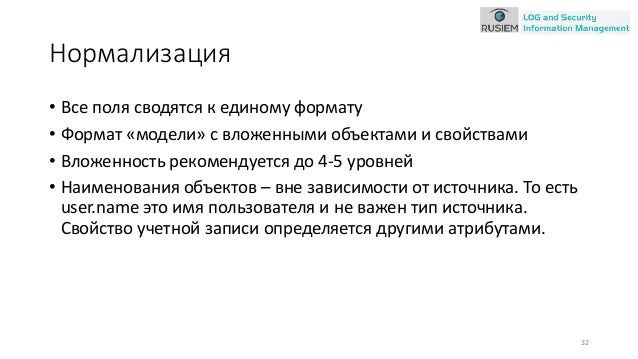 31. Нормализация • Все поля сводятся к единому формату • Формат «модели» с вложенными объектами и свойствами • Вложенность рекомендуется до 4-5 уровней • Наименования объектов – вне зависимости от источника. То есть user.name это имя пользователя и не важен тип источника. Свойство учетной записи определяется другими атрибутами. 32