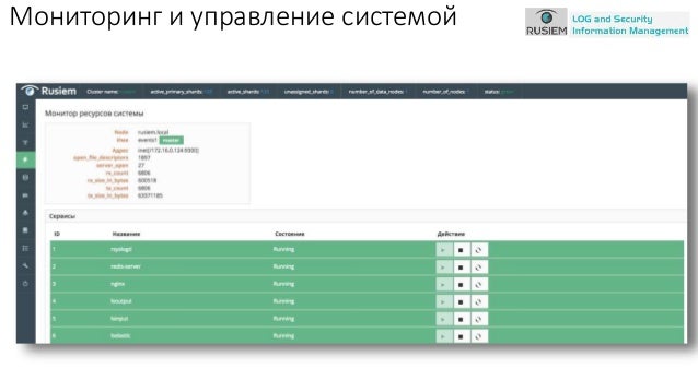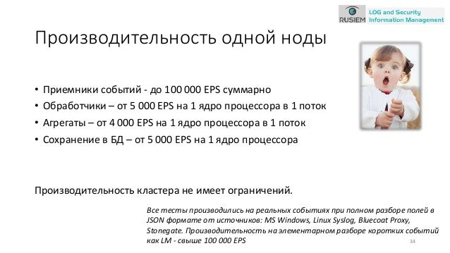 33. Производительность одной ноды • Приемники событий - до 100 000 EPS суммарно • Обработчики – от 5 000 EPS на 1 ядро процессора в 1 поток • Агрегаты – от 4 000 EPS на 1 ядро процессора в 1 поток • Сохранение в БД – от 5 000 EPS на 1 ядро процессора Производительность кластера не имеет ограничений. Все тесты производились на реальных событиях при полном разборе полей в JSON формате от источников: MS Windows, Linux Syslog, Bluecoat Proxy, Stonegate. Производительность на элементарном разборе коротких событий как LM - свыше 100 000 EPS 34