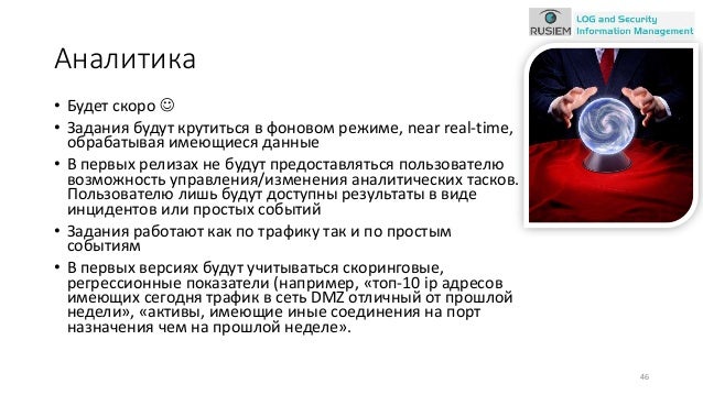 45. Аналитика • Будет скоро • Задания будут крутиться в фоновом режиме, near real-time, обрабатывая имеющиеся данные • В первых релизах не будут предоставляться пользователю возможность управления/изменения аналитических тасков. Пользователю лишь будут доступны результаты в виде инцидентов или простых событий • Задания работают как по трафику так и по простым событиям • В первых версиях будут учитываться скоринговые, регрессионные показатели (например, «топ-10 ip адресов имеющих сегодня трафик в сеть DMZ отличный от прошлой недели», «активы, имеющие иные соединения на порт назначения чем на прошлой неделе».