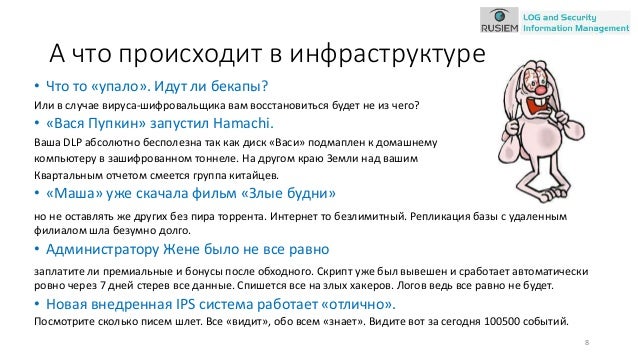 7. А что происходит в инфраструктуре • Что то «упало». Идут ли бекапы? Или в случае вируса-шифровальщика вам восстановиться будет не из чего? • «Вася Пупкин» запустил Hamachi. Ваша DLP абсолютно бесполезна так как диск «Васи» подмаплен к домашнему компьютеру в зашифрованном тоннеле. На другом краю Земли над вашим Квартальным отчетом смеется группа китайцев. • «Маша» уже скачала фильм «Злые будни» но не оставлять же других без пира торрента. Интернет то безлимитный. Репликация базы с удаленным филиалом шла безумно долго. • Администратору Жене было не все равно заплатите ли премиальные и бонусы после обходного. Скрипт уже был вывешен и сработает автоматически ровно через 7 дней стерев все данные. Спишется все на злых хакеров. Логов ведь все равно не будет. • Новая внедренная IPS система работает «отлично». Посмотрите сколько писем шлет. Все «видит», обо всем «знает». Видите вот за сегодня 100500 событий. 8