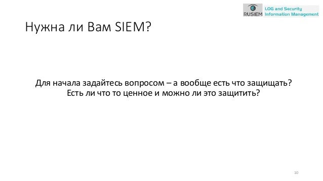 9. Нужна ли Вам SIEM? Для начала задайтесь вопросом – а вообще есть что защищать? Есть ли что то ценное и можно ли это защитить? 10