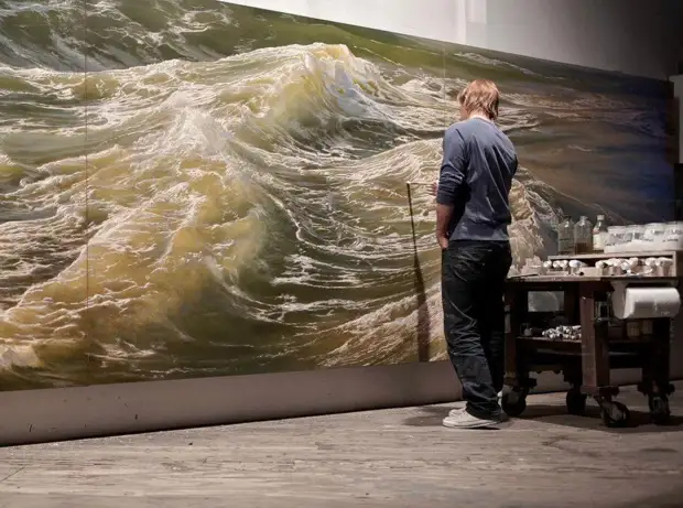Главная страсть художника — оттенки морской воды в каждом её состоянии. Чтобы добиться максимальной глубины цвета, Ортнер идёт по стопам старых мастеров: сам варит краски из минеральных пигментов и растительных масел, нагревая их на спиртовке. Вместо современных титановых белил он использует свинцовые — токсичные, но, как он шутит, «я же их не ем».