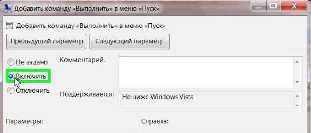 В правой части окна найдите: Добавить команду "Выполнить" в меню "Пуск" и щелкните по ней. Слева увидите "Изменить параметр политики", нажмите его и в открывшемся окне отметьте пункт "Включить".