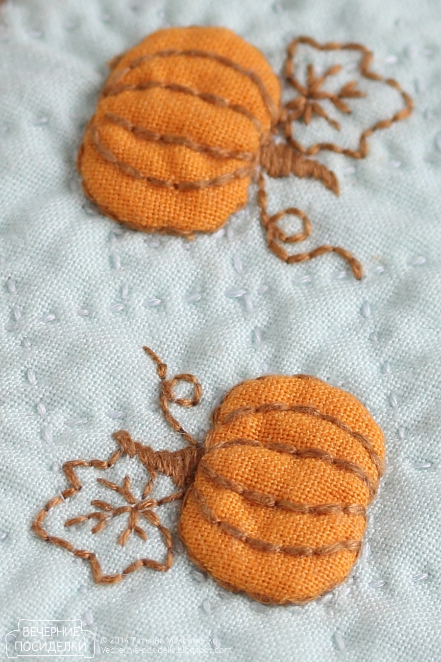 Тыковки размером 2х1,3см — объёмная аппликация. На косметичку вместилось 15 штук. Основа простёгана прямоугольниками, направленными в разные стороны.