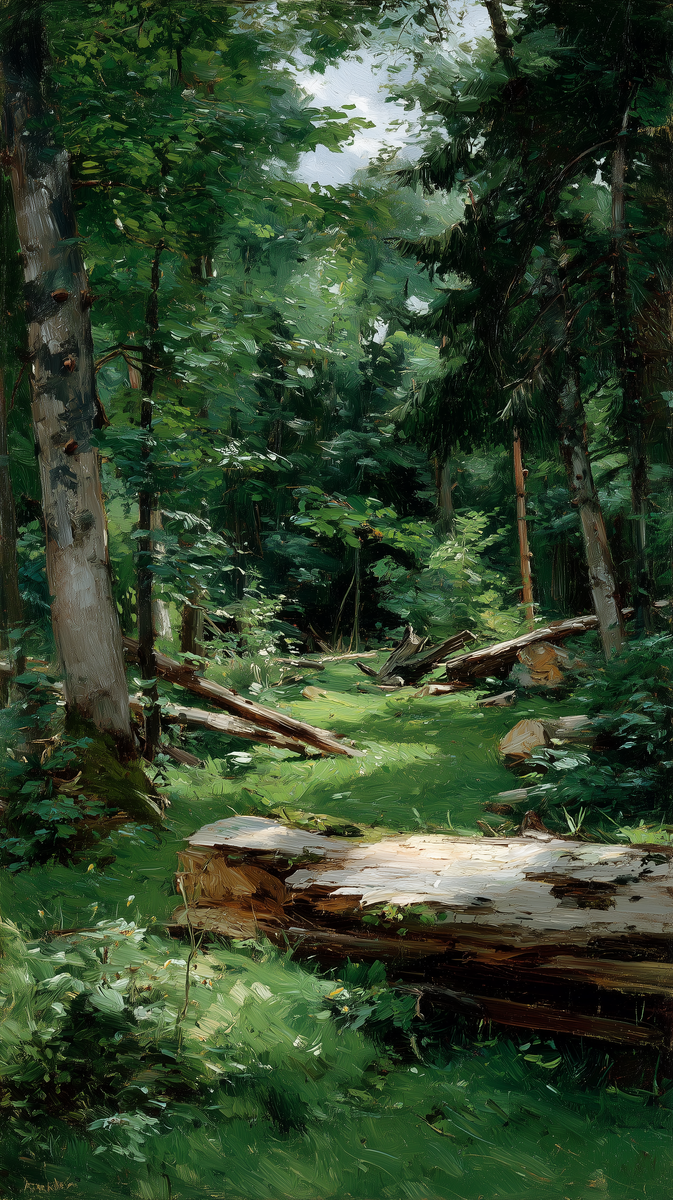 На картине изображён густой лес, наполненный мягким зелёным светом. Высокие деревья с разной корой — от светлых берёз до тёмных хвойных — создают ощущение глубины и прохлады. Сквозь листву пробиваются рассеянные лучи солнца, освещая небольшую поляну в центре.