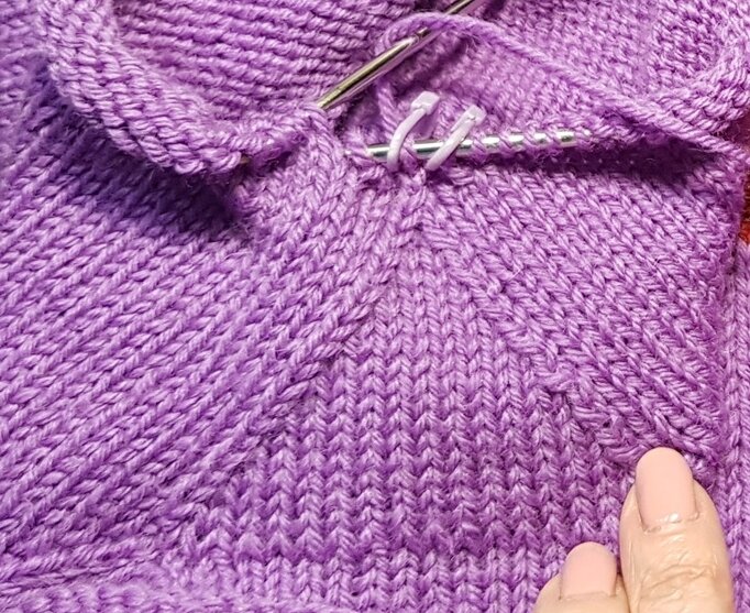 Дальше вяжу тушку до нужной длины. Для вязания рукава, переносим снятые петли на спицы и набираем петли подреза сбоку из полотна 2 петли, а потом по линии набранных дополнительных петель и с другого бока полотна 2 петли.