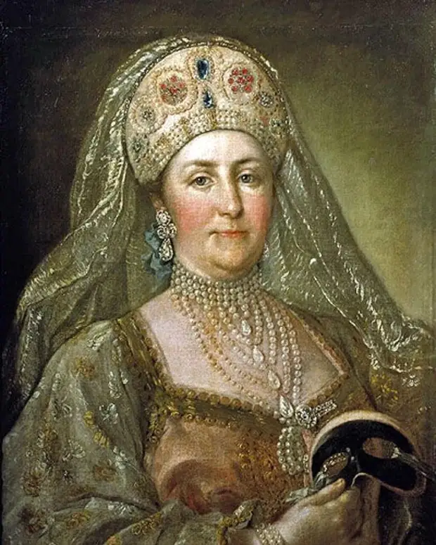 Русский наряд императрицы с кокошником и сарафаном с пышными рукавами на этом портрете — маскарадный костюм. Мы знаем это, поскольку Екатерина держит в руках обычную карнавальную маску. Любопытно сравнить картину с маскарадным портретом ее предшественницы — императрицы Елизаветы: «дщерь Петрова» выбрала просто черное домино, а вот бывшая немецкая принцесса подчеркивает свою связь с новой родиной.