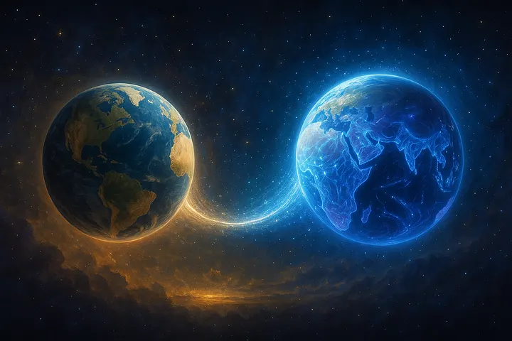 Земля разделилась на две сосуществующие реальности: одна остаётся в плотных ритмах третьего измерения, укоренённого в дуальности и контрасте; другая поднимается в пятое измерение, пульсируя единством, миром и кристаллическим светом.