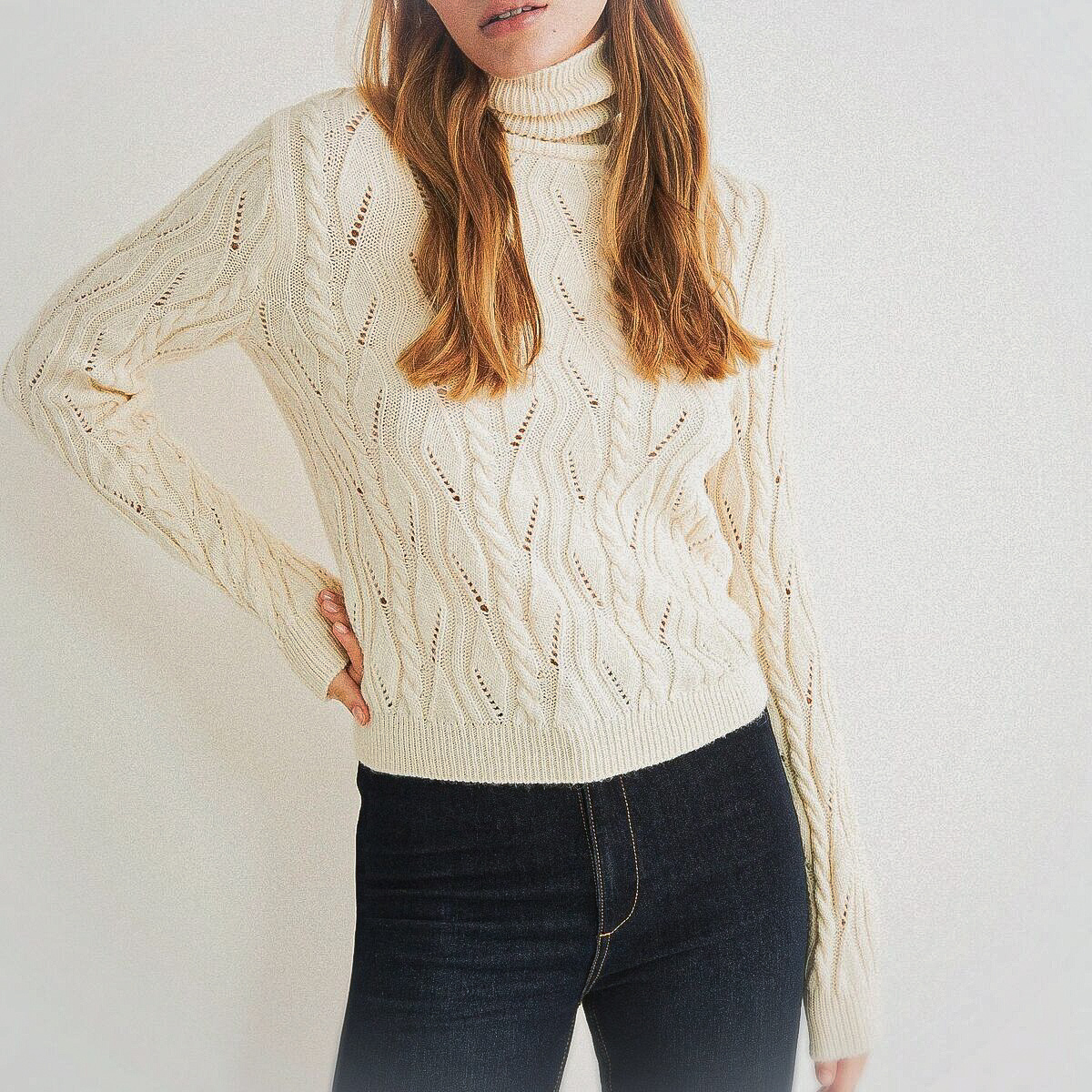 Узор джемпера построен на чередовании простых вертикальных жгутов и ажурного геометрического мотива в виде ромбов. Такое сочетание всегда смотрится выигрышно: жгуты добавляют рельеф и структуру, а ажур делает полотно визуально интереснее.