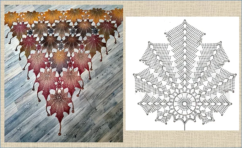 ![]() 4 вп, 1 ст с/н, 12 вп… повт. 1 ряд: 1 сбн, 3 вп, 1 сбн; 8 вп → 2 сбн; 3 вп → 5 сбн; 4 вп → 5 сбн; веер: 8 рядов сбн. 2 ряд: вп + сбн. 3 ряд: сместить веера. 4 ряд: вп + сбн. |