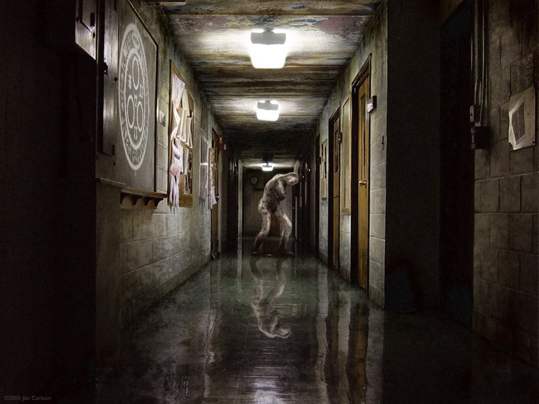 По факту: Синий фильтр. Кажется, больница. Художественный бардак. Кровь на полу. Кого-то (или что-то) тащили. Возможно, коляску. За дверьми видна кладка противоположной стены, что еще раз подтверждает бесшовность локаций.