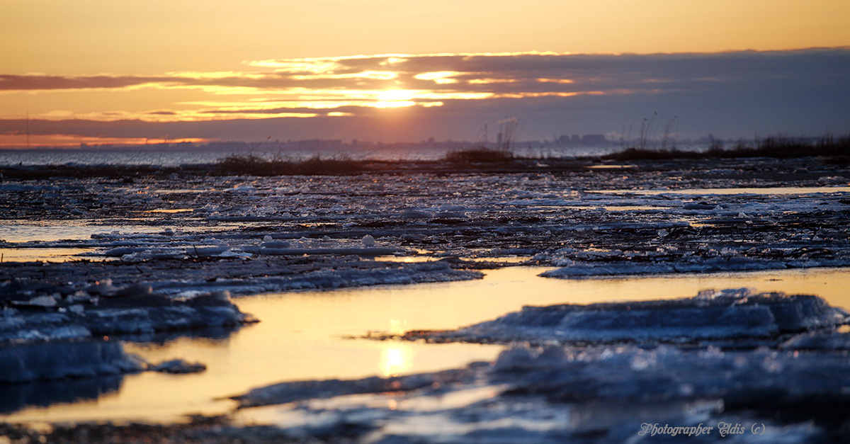 Лёд на берегу уже потихоньку оплавился, в этом году он не трескается на большие льдины, а просто тихонько оплывает, словно плавится.