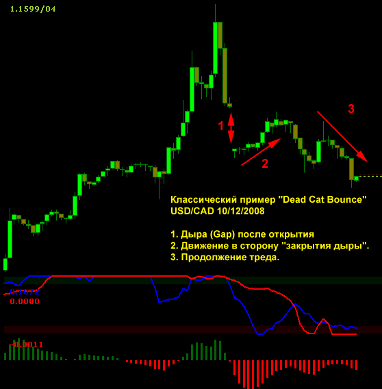 Мораль ситуации такова - если вы видите, что при открытии новой недели образовалась дыра, не спешите с торговлей, дайте движению устояться, иначе вы рискуете нарваться на отскок дохлого кота.