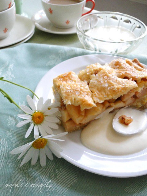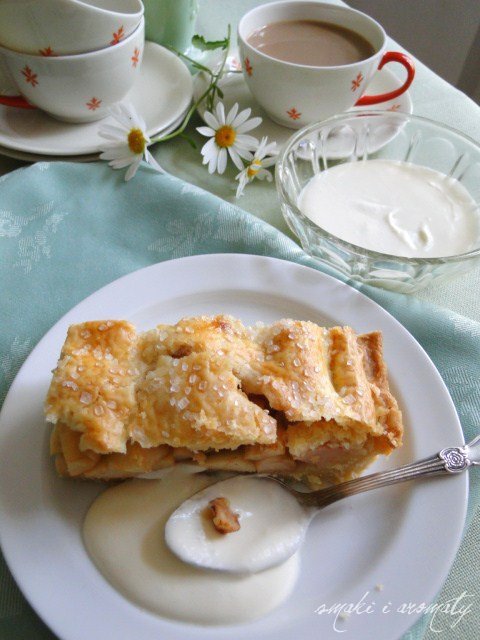 Удалить podpieczony дна, распространяются с белком избит и положить яблоки. Посыпать корицей и сахаром. Раскатать вторую часть теста и покрыть начинкой. Нажмите на банки не потушить сока яблок. Кисть избит целое яйцо и посыпать грубой сахара. Укол теста острым ножом в нескольких местах.