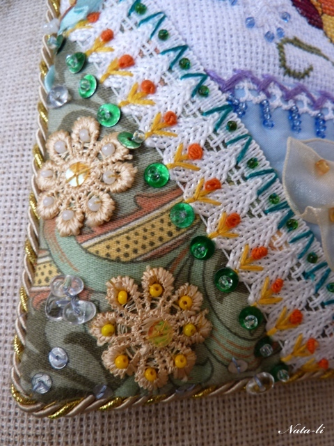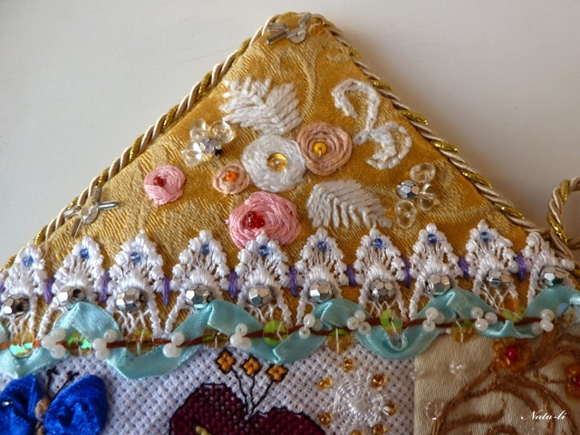 Многое делала в этой вышивке впервые: и французский узелок, и различные простенькие швы, и вышивку лентами.