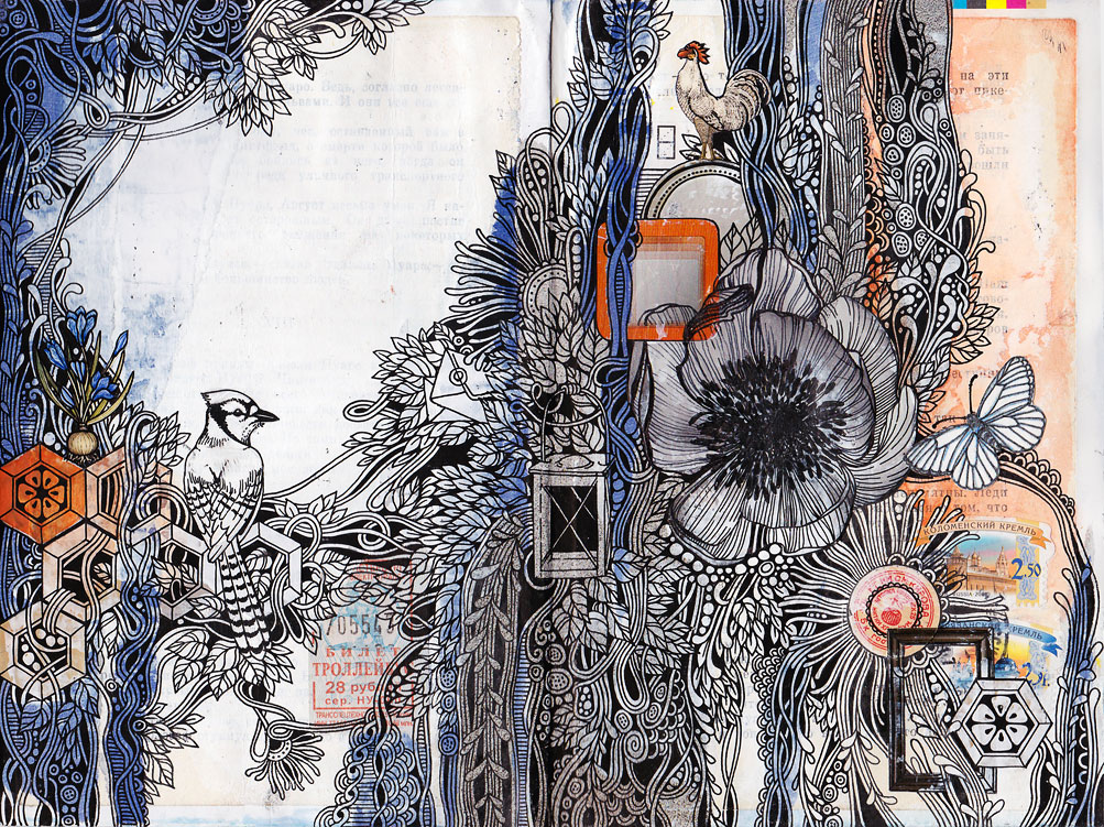 Да-да, снова медитативное заклеивание фона бумажками, возюканье грунтом и заполнение пространства "шнурками", "tangl'ами" и прочими линиями... ![]()