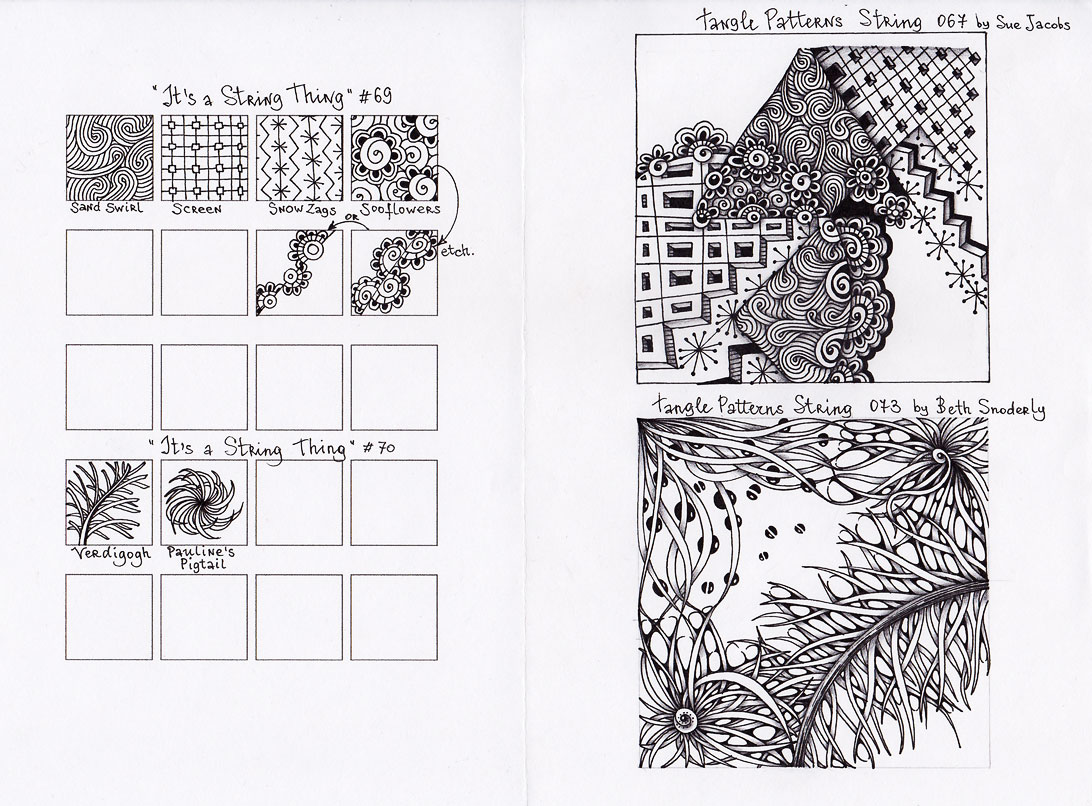 А я пока покажу ещё один разворот с "игрой" от Adele Bruno - "It's a String Thing". Здесь у меня два квадратика zentangle, нарисованных по двум разным заданиям.