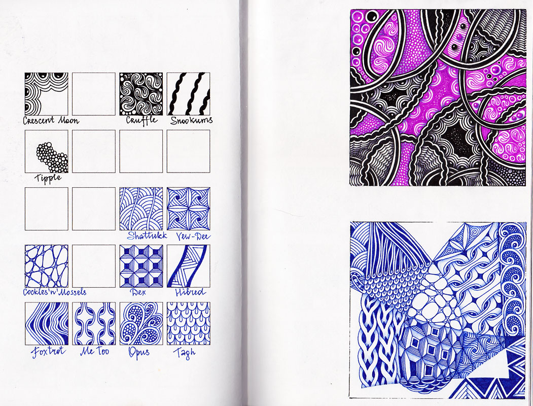 На левой странице нарисованы узоры (паттерны) с их названиями, а на правой странице - сами плитки Zentangle, составленные из предлагаемых паттернов.