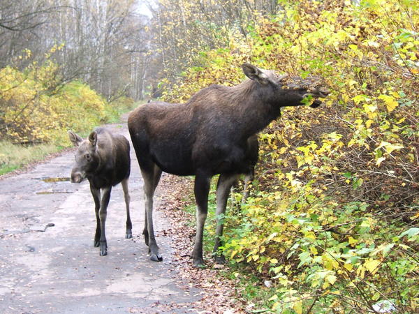 Можно увидеть там и лося с белкой в одном кадре. Эта грациозная плутовка явно переигрывает флегматичного недотёпу. Особенно часто встречаешь лосей зимой и по весне, когда лес становится трудно проходимым, и они принимаются ломать и объедать молодые побеги веток деревьев и кустарников вдоль дорог. Людей не боятся, провожают равнодушным взором в метре от дороге, хорошо ещё, хоть в детские коляски не заглядывают. Особенно обожают осину и даже обгладывают её кору, как и зайцы. Летом, когда поднимается трава, лоси уходят в глубину леса, переходя на подножный корм. Опять зима, опять навалит снега - и лоси снова на городских дорогах. В столице нашей Родины, так сказать.