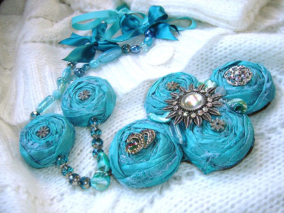 Ткани интересной расцветки, необычной фактуры, использование различных пуговиц, страз, бусин, ронделей - всё это делает цветы красивым украшением ручной работы.