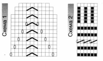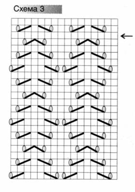 с 1 по 23 ряд, затем 3 ряда гладь и по этой же схеме с 25 по 31 ряд - но только уголок, внутри вязала лицевыми.Закончить 2 вместе и 5 воздушных петель.