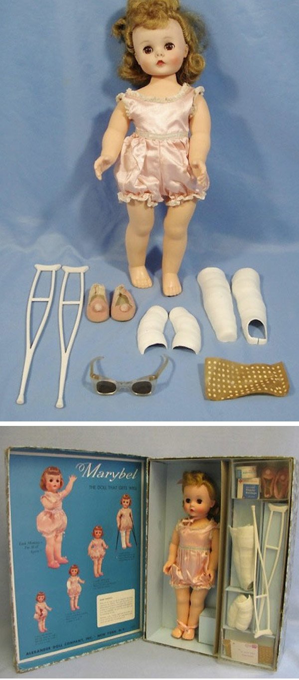 В 1959 году в Америке появилась недружелюбная кукла Мэрибел (которую вскоре начали называть Куклой, которая выздоравливает). Вместе с Мэрибел поставлялись медицинские принадлежности: костыли, пластыри, гипсовые повязки, марля и клейкая лента.