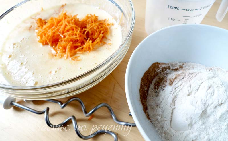 Следующий шаг – трем морковку на мелкую тёрочку. Засыпаем сахаром. Вот тут-то я и отошел от канонического рецепта. Похлебкин пишет, что сахара надо столько же по объему, сколько и морковки, а я посчитал, что больно сладенько получится и засыпал морковку приблизительно половиной объема сахара. Получилось все равно очень сладко. Но не очень приторно. Теперь накрываем морковку с сахаром пленочкой и на пять часов забываем о них. | Я забыл на ночь, и от этого никому плохо не стало, так, что имею полное моральное право советовать и Вам так делать. Утром засыпал морковку половинкой стакана муки, половинкой чайной ложечки соды и занялся яйцами.