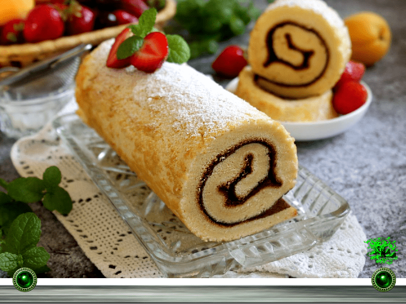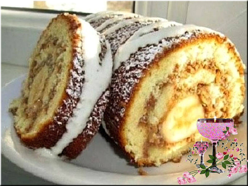 Сверху рулет украсьте на свое усмотрение можно полить шоколадом, глазурью или просто посыпать пудрой.