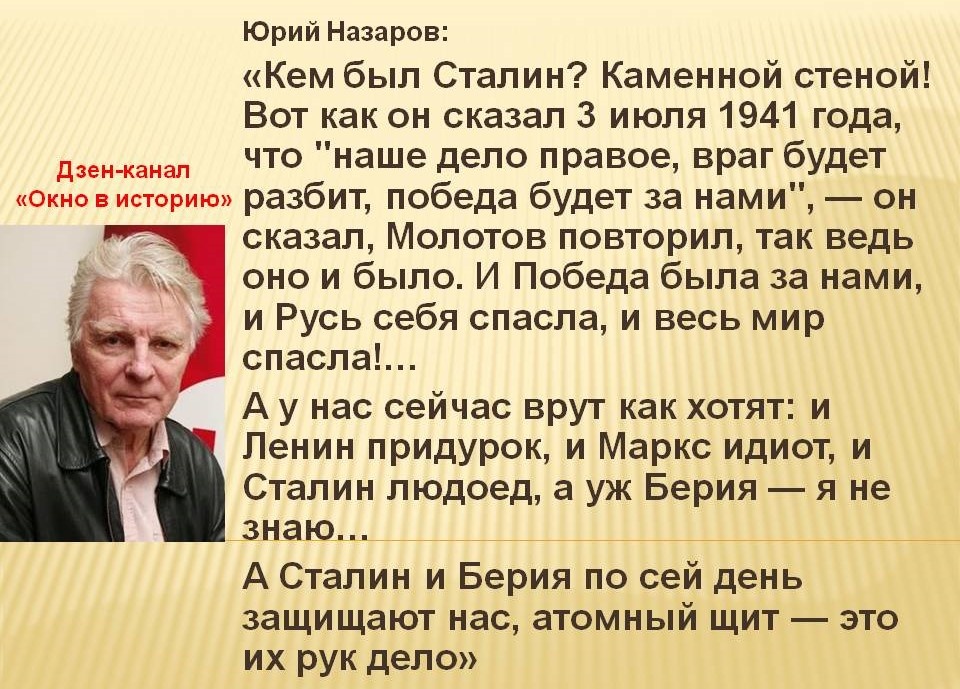 К счастью есть ещё среди известных людей в творческой среде нашей страны те немногие, кто как советский актёр и по-настоящему Народный артист Юрий Владимирович Назаров, отстаивают правду о Великой Отечественной и настоящий смысл праздника 9 мая - Дня Победы.
