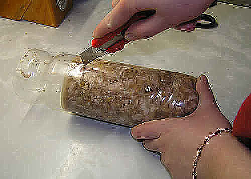 7. К мясу можно добавить грецкие орехи и репчатый лук, предварительно их обжарив на растительном масле. Итак, когда рулет застынет, разрезаем аккуратно бутылку и освобождаем его.