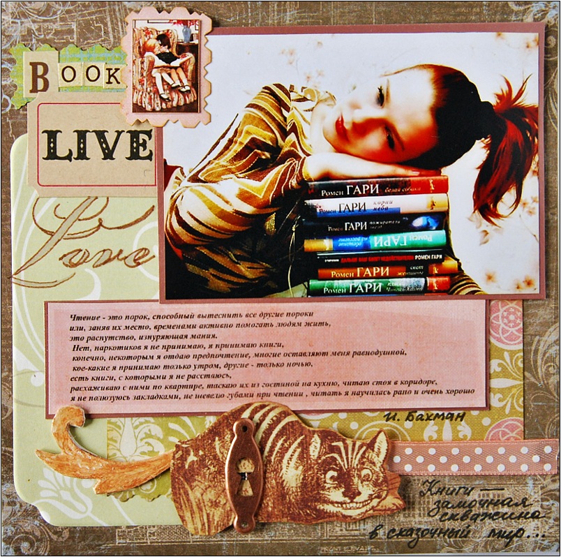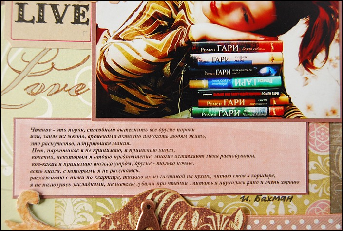 Страничка участвует в задании от Города Рукоделия "Смысловые галлюцинации" и сначала я хотела запечатлеть на ней какую-нибудь цитату из Гари... Листала книги, свои записные книжки - провела в приятном окружении чудесных слов целый день и ничего не выбрала. Слишком многое хочется цитировать ;) Проще переписать несколько его романов, но это уже не страница в альбом... И тут всплыла фраза из романа "МАлина", не менее потрясающей писательницы Ингеборге Бахман - фраза вообще о чтении. В свое время она задела меня за живое своей искренностью. Я тогда шарахалась от определения "книжная девочка" (и даже от вопроса "вы любите читать?), которое стало популярным после глупейшего произведения "13-ая сказка" и была рада словам Бахман, которые могли описать, что же такое настоящее чтение.